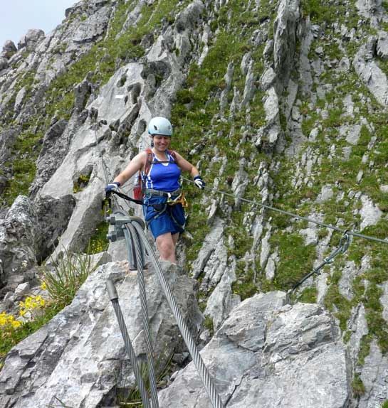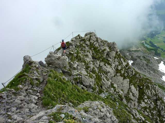 Gleich am Anfang muss ein bisschen geklettert werden, aber zum Glück kann man sich immer am Stahlseil festhalten oder notfalls sogar raufziehen. Trotzdem ist eine gute Trittfestigkeit und ein bisschen Erfahrung im Felsklettern von Vorteil. Oben auf dem Gipfel geniesst man eine wunderschöne Aussicht, vorausgesetzt es hat keinen Nebel.